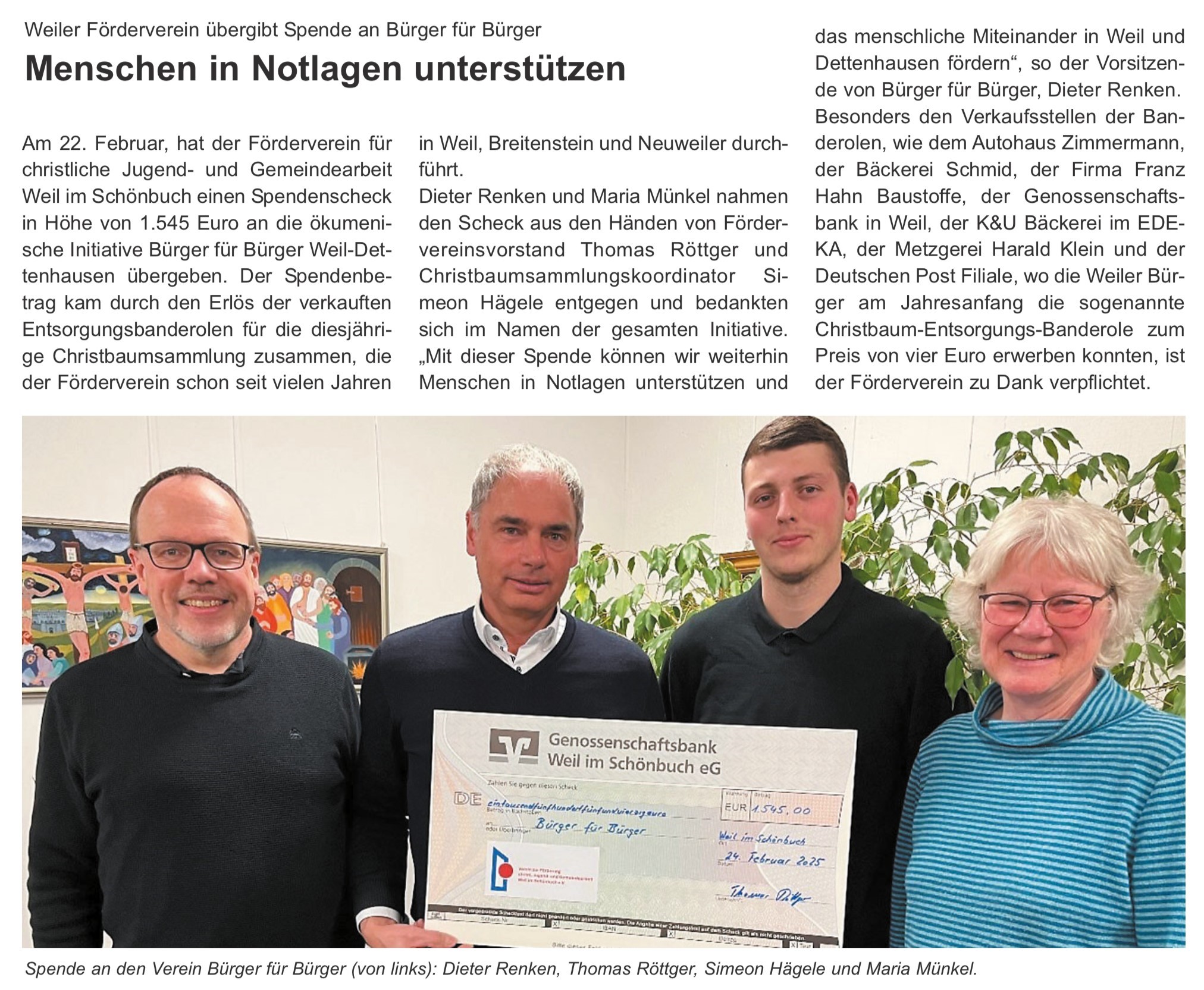 Weiler Förderverein übergibt Spende an Bürger für Bürger